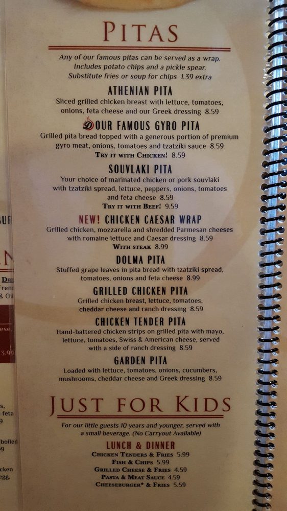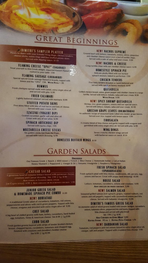 Start your culinary journey with the Avgolemono Soup, a comforting blend of rich chicken broth, rice, and tangy lemon, or indulge in the famed Saganaki, flaming cheese perfection. For the main course, the Dimitri's Shish Combo brings together tender pork, chicken kebabs, and flavorful shish kafta, complemented by fragrant rice pilaf and fresh vegetables.